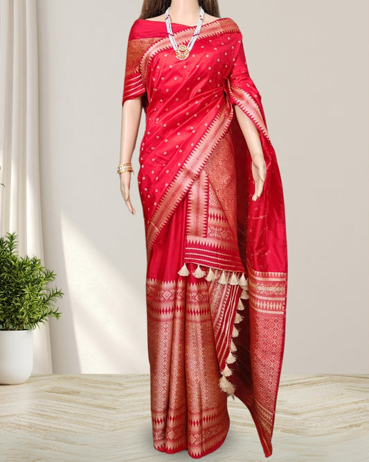 Red mulberry silk Bridal mekhela sador with tussar motifs