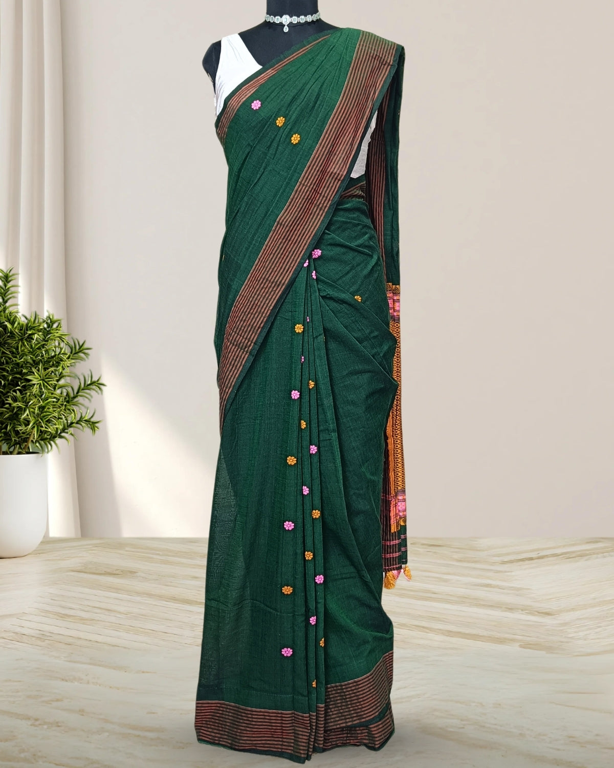 Bottle green pure cotton saree with designer motifs