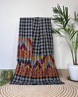 Design: Features traditional Mising tribal motifs, on Pajok (chequered) pattern fabric work